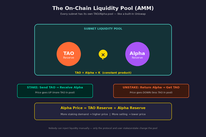 dTAO는 이 모든 것을 시장 주도 시스템으로 대체했습니다. 이제 모든 서브넷은 알파 토큰(alpha token) 이라는 자체 토큰을 갖습니다. 서브넷에 TAO를 스테이킹하면, 온체인 AMM(자동화 마켓 메이커)을 통해 TAO를 해당 서브넷의 알파 토큰으로 교환하는 것과 같습니다. 유니스왑과 같은 개념이지만, 체인 자체에 내장되어 있습니다.