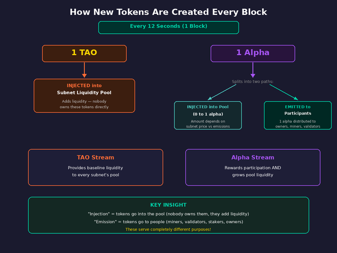 - 각 풀에 TAO(현재 블록당 총 0.5 TAO, 서브넷 간 분배)와 가변적인 양의 알파를 인젝션