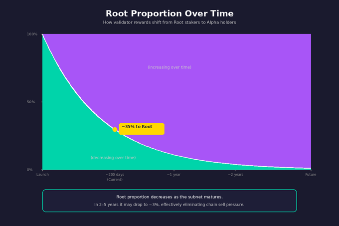 서브넷이 처음 생겼을 때는 밸리데이터 보상의 100%가 루트 스테이커에게 갑니다. 시간이 지나면서 서브넷의 알파 공급량이 증가함에 따라 그 비율이 낮아집니다. 약 200일이 지나면 루트로 약 3540%가 가고, 나머지 6065%는 알파 홀더에게 남습니다.