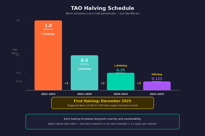 비트코인과 같은 개념입니다. 이미션 속도가 주기적으로 절반으로 줄어듭니다. 첫 번째 TAO 반감기는 2025년 12월에 발생했습니다.