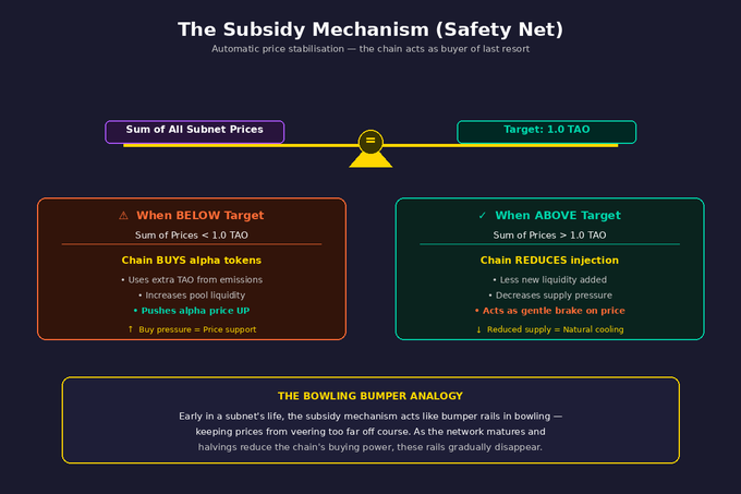- 가격이 목표 이하? 체인이 이미션의 추가 TAO로 알파 토큰을 매수해 가격을 올립니다. 사실상 최후의 매수자 역할입니다.