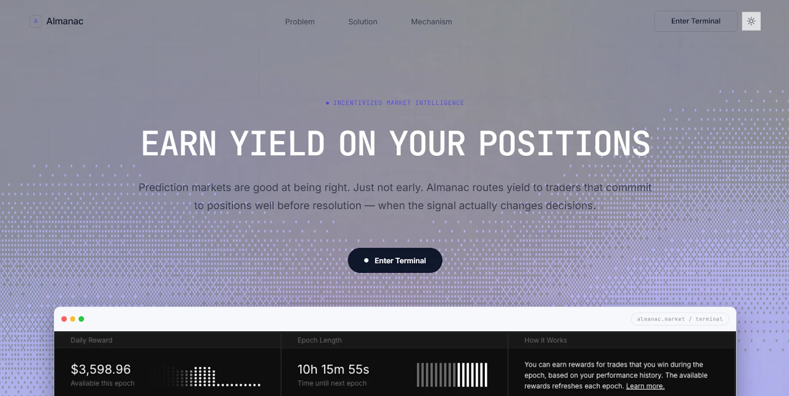 Almanac은 예측을 측정 가능하고, 경쟁적이며, 경제적으로 의미 있는 것으로 재정의한다. 그것은 불확실성 속에서 진실을 위한 시장이다.