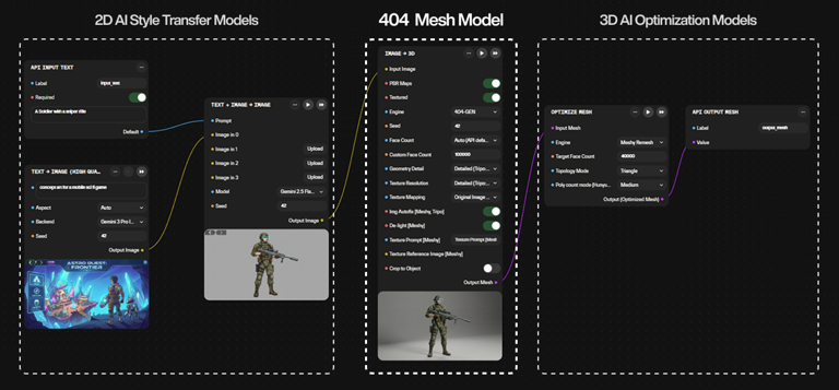 이 광범위한 향상 파이프라인은 404의 핵심 3D 생성 외에도 2D 이미지, 영상, 리깅(rigging), 애니메이션 모델을 통합하여, 궁극적으로 404의 출력물을 엔터프라이즈에 더욱 가치 있게 만듭니다.