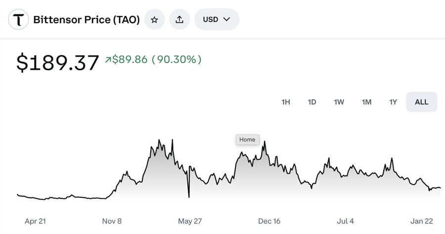 TAO는 Kraken과 Coinbase 등 주요 암호화폐 거래소에 상장되어 있으며, 다른 주류 암호화폐처럼 구매할 수 있다. TAO는 이번 주 기준 약 185달러에 거래되고 있으며, 시가총액은 약 15억 달러다.