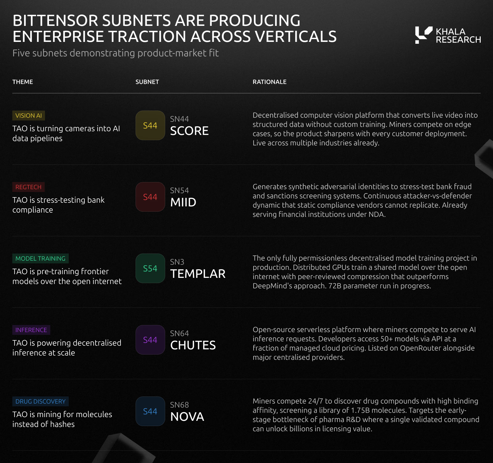 서브넷들은 수익을 창출하고, 기업 고객에게 서비스를 제공하며, 학술 심사를 통과하는 연구를 생산하고 있습니다. 실제 고객이 실제 돈을 지불하고 있으며, 이는 검증된 트랙션으로 생태계의 장기적 생존 가능성에 대한 리스크 프로파일을 변화시키고 비대칭적 상승 잠재력을 제공합니다.