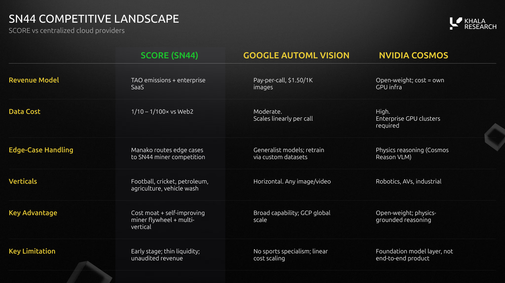 - Nvidia Cosmos: 다른 스택 레이어에서 운영 — SN44가 출력에 보상하는 마켓플레이스인 반면, Cosmos는 마이너가 사용할 수 있는 오픈웨이트 파운데이션 모델을 제공