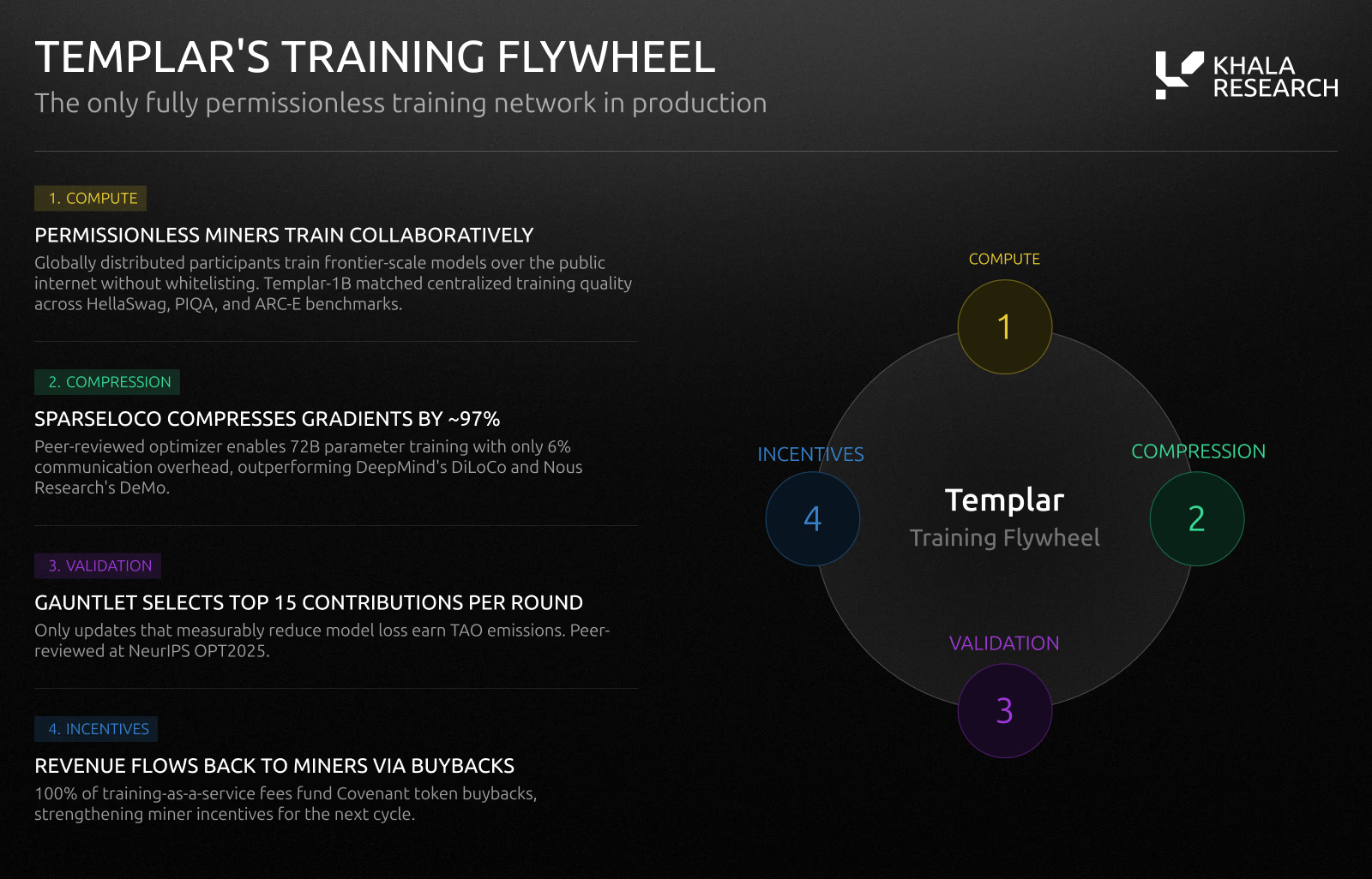 Templar의 궤도는 두 가지 이정표에 달려 있습니다: Covenant 72B 완성과 벤치마크 결과. 최종 모델이 동등한 규모에서 중앙화 기준선을 충족하거나 능가한다면 테제가 검증됩니다.
