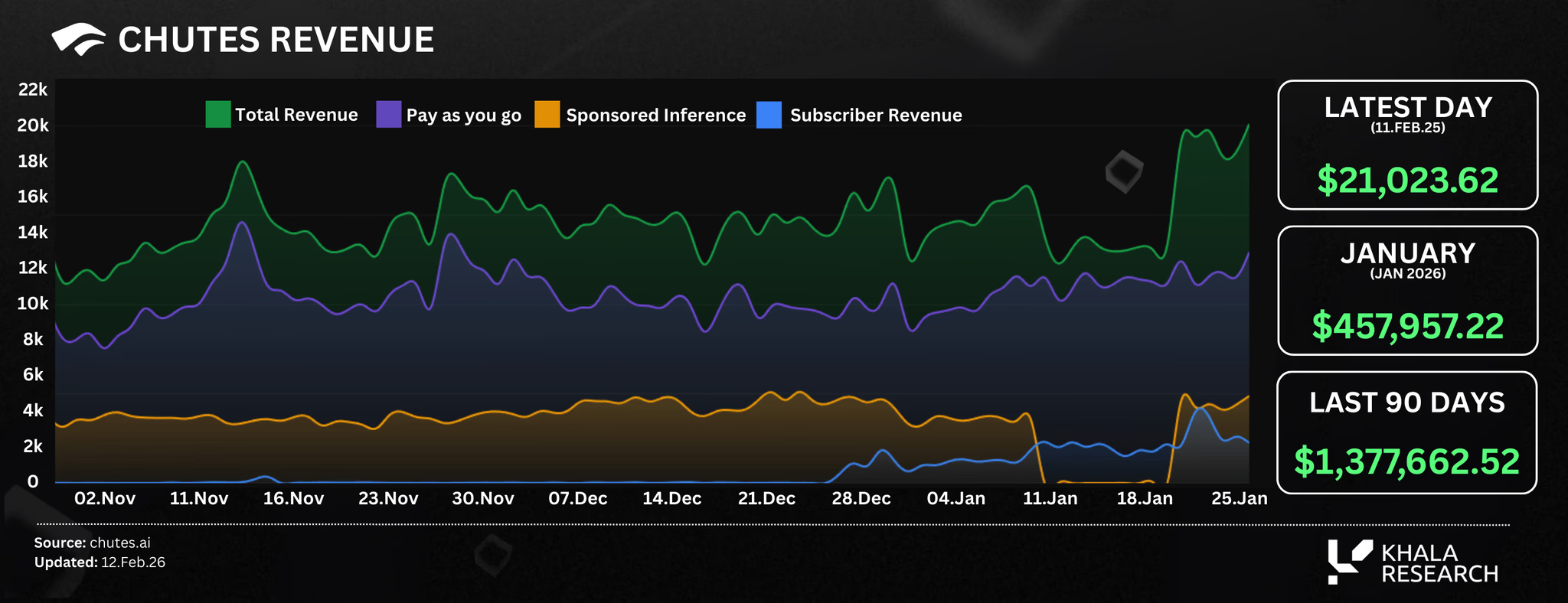 지난 12개월 동안 128개의 독립 서브넷으로 성장했습니다. 현재 네트워크는 실제 피아트 수익(Chutes만 연환산 $550만), 기관 자본 유치(Yanez, DCG의 Yuma, Deep Ventures), 그리고 다양한 버티컬에서 기업 고객 계약(SCORE via Reading FC, AVIA)을 달성하고 있습니다.