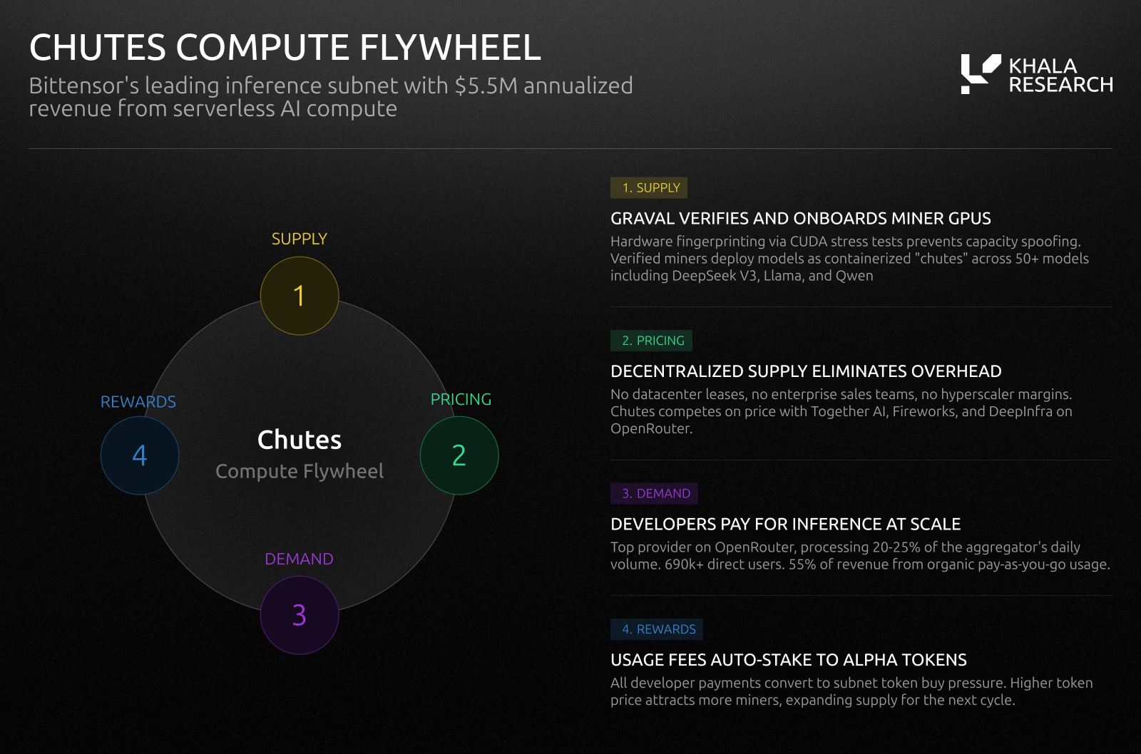 Chutes는 GPU 공급을 개발자 수익으로 전환하는 4단계 컴퓨팅 플라이휠로 운영됩니다.
