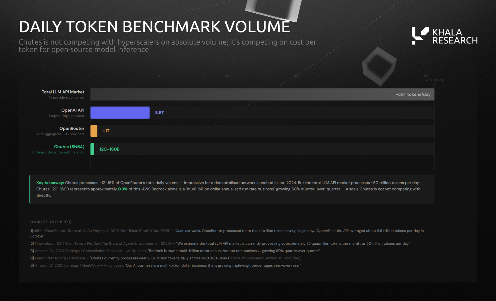 연환산 $550만 수익 구성: 종량제(pay-as-you-go) 55%, 후원 추론 25%, 구독 5%, 바운티 5%. 종량제가 압도적인 비중을 차지하는 것은 마케팅 보조금이 아닌 진정한 개발자 사용을 의미합니다. 다만 25%가 여전히 후원 방식이므로, Chutes가 성숙해 가는 과정에서 유기적-후원 비율이 핵심 지표입니다.