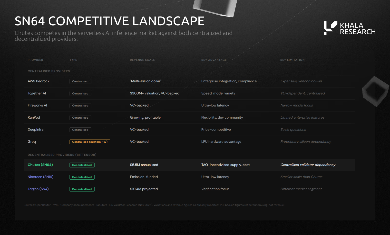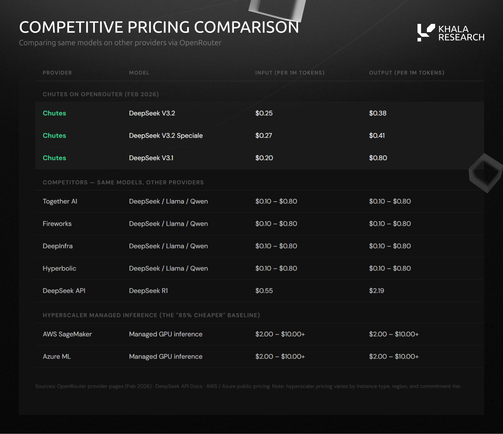 Chutes는 서버리스 AI 추론 시장에서 중앙화 및 탈중앙화 공급업체와 경쟁합니다. 주로 오픈소스 모델 추론(DeepSeek, Llama, Qwen, Mistral)을 제공합니다.