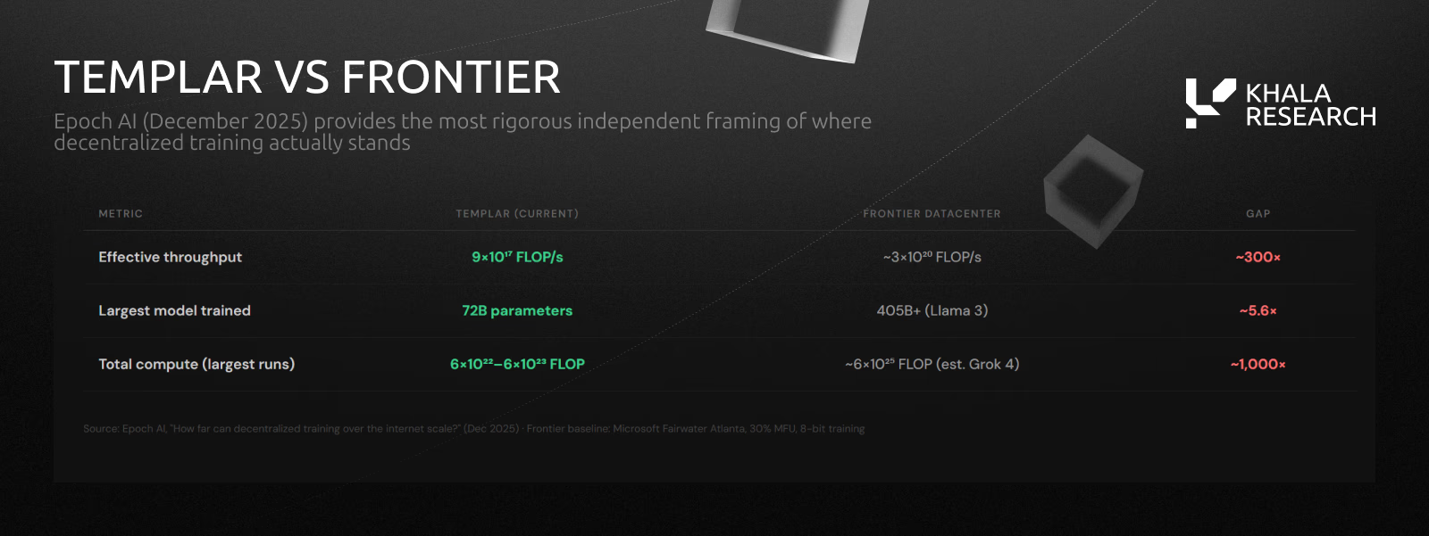 Templar는 실효 처리량에서 프론티어 데이터센터보다 ~300배 작습니다. 하지만 탈중앙화 훈련 컴퓨팅은 2020년 이후 600,000배 성장했습니다. 이는 연 ~20배의 성장률을 의미하며, 이는 ~5배의 프론티어 AI 훈련 성장률을 훨씬 능가합니다. 이 궤도가 유지된다면, 격차는 2-3년 내에 상당히 좁혀집니다.