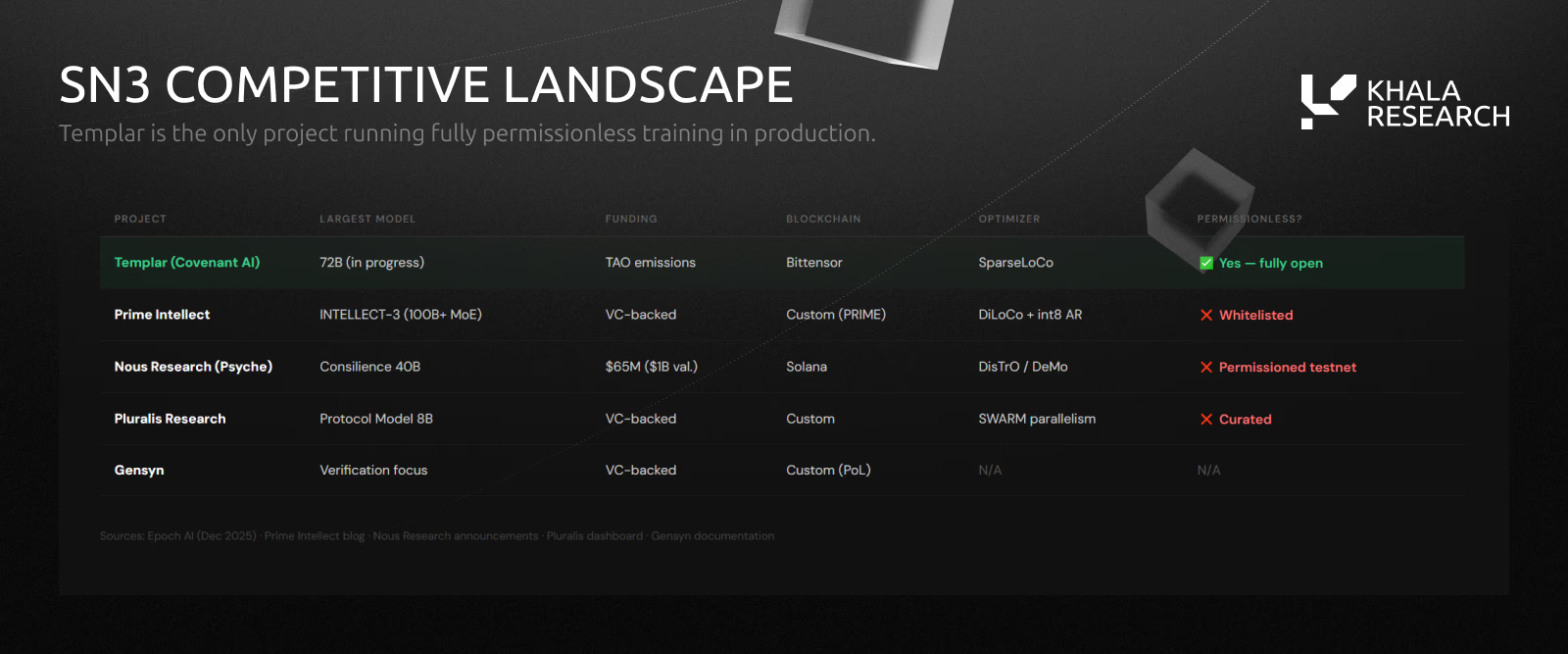 - Prime Intellect와 Nous Research/Psyche는 상당한 벤처 자본 조달. Templar는 여전히 TAO 에미션과 토큰 이코노믹스로 운영