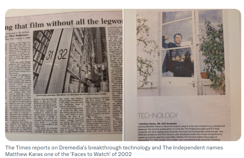 더 타임스(The Times)는 Dremedia의 혁신 기술을 보도했고, 인디펜던트(The Independent)는 매슈 카라스를 2002년 '주목할 인물'로 선정했다.